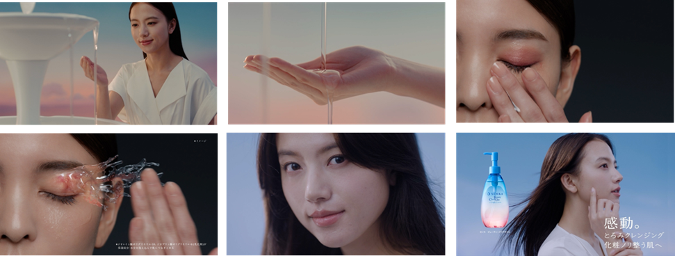 今回のTVCMで描かれるのは、噴水のようにわき上がる液体をそっと手に受け止め、その質感を確かめる瞬間。厚みがありながらも、肌にやさしく寄り添うような質感が、メイクや汚れをしっかり落としながら、うるおいを残す――その心地よさを、清原さんの手元の繊細な動きと、表情の変化によって丁寧に表現しています。