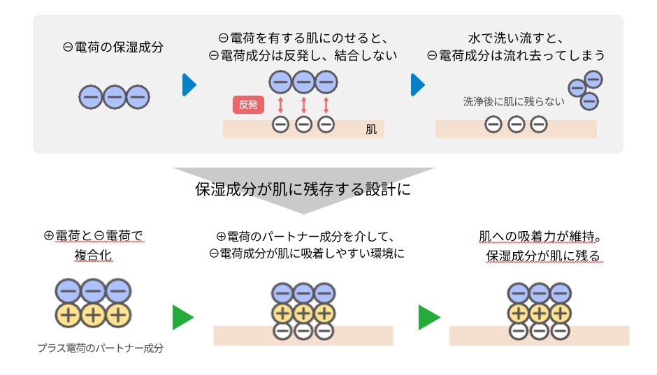 シロキクラゲ多糖体は保湿成分として様々なスキンケア商品にも活用されています。しかし、肌と同じ⊖の電荷を持つという特性から、肌と反発してしまい、洗顔料中にある保湿成分が洗浄後に留まりにくいという課題がありました。そこで、⊖電荷を持つ保湿成分に⊕の電荷を有する他の成分を複合化することで、電気的反発を抑制し、洗浄後の肌に保湿成分を留める設計に。